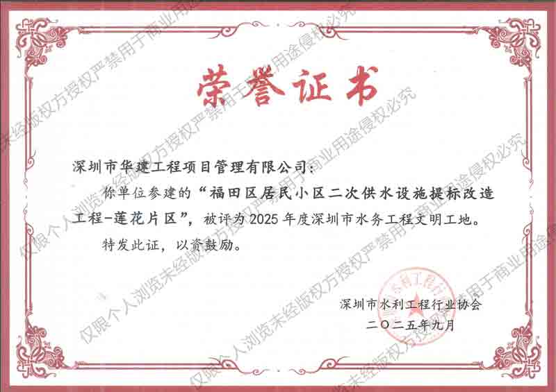 荣誉证书-福田区居民小区二次供水设施提标改造工程-莲花片