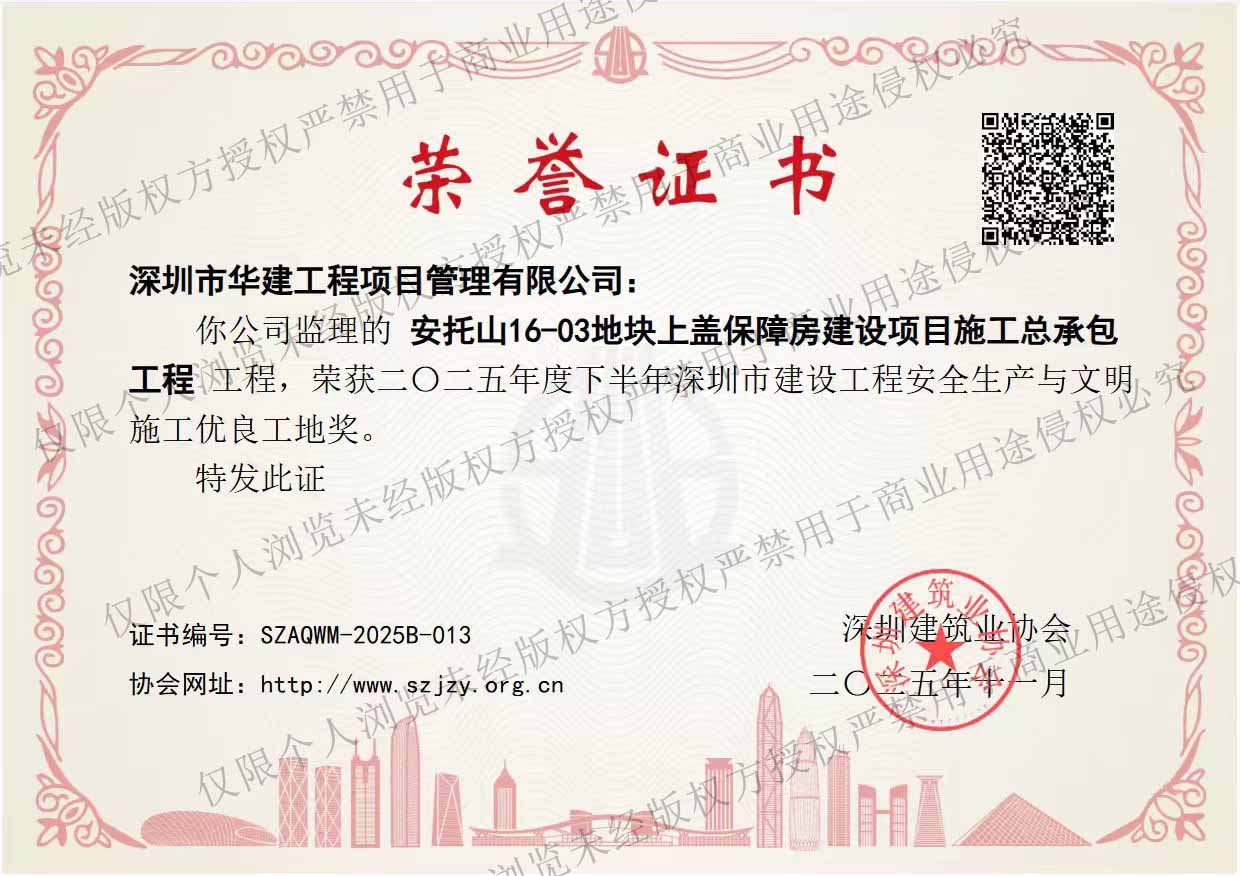 荣誉证书-安托山16-03地块上盖保障房建设项目监理