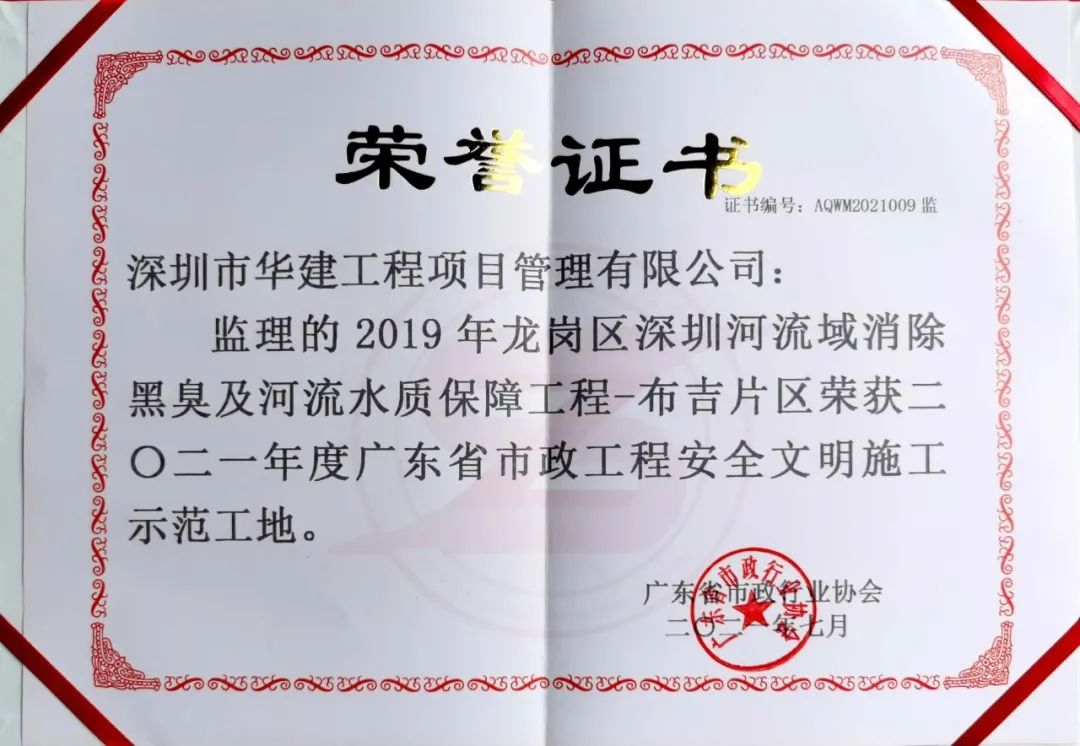 近日,由华建承监的2019年龙岗区龙岗河流域、观澜河流域、深圳河流域消除黑臭及河流水质保障工程监理第14标段(布吉街道市政管网工程部分监理)荣获2021年度广东省市政工程安全文明施工示范工地荣誉称号。在此,公司对辛勤参监的全体监理人员表示衷心的感谢。