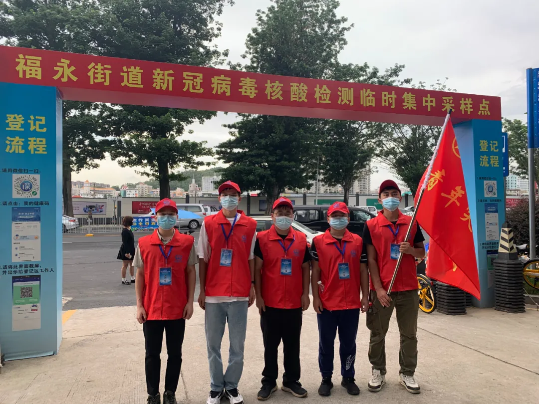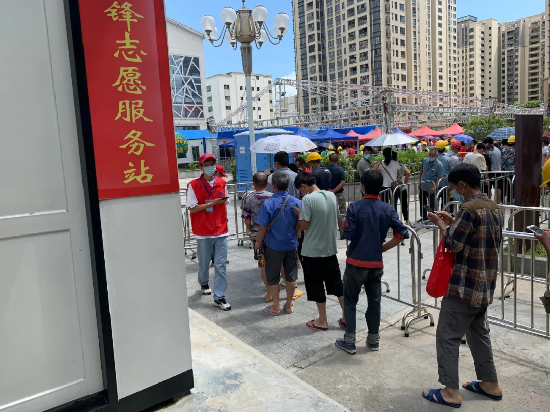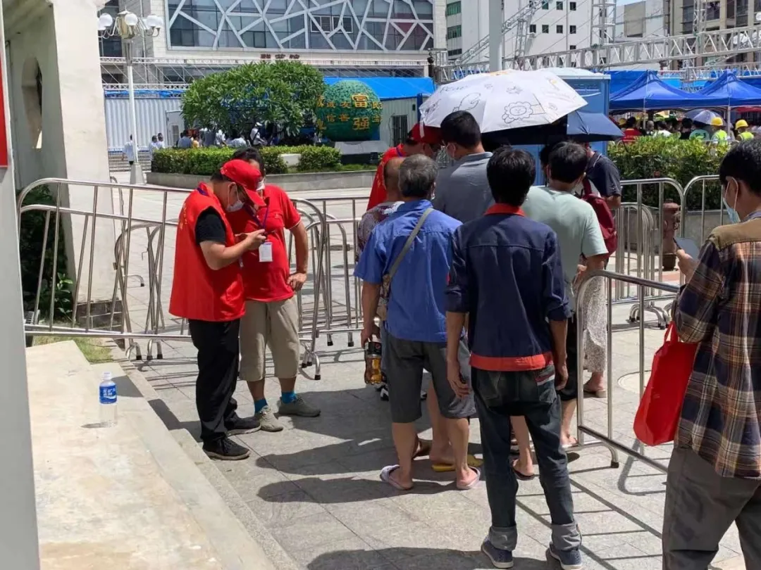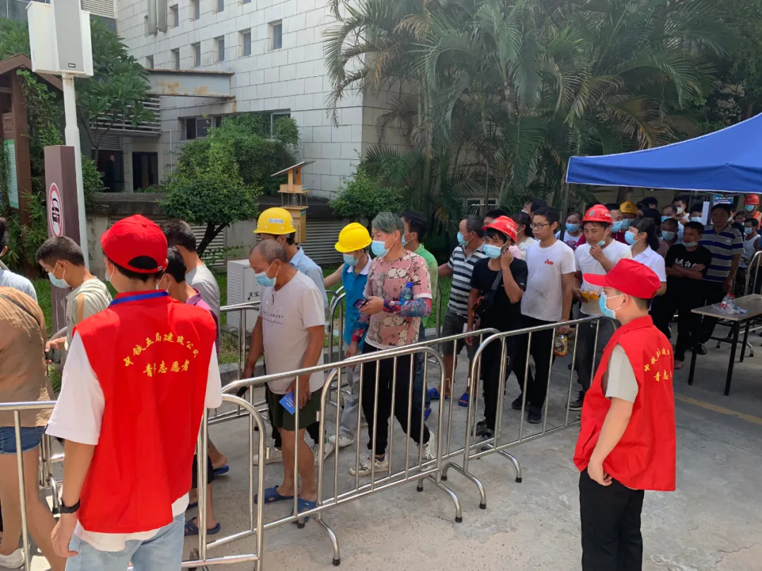 8月12日下午,华建青年突击队队员宋学贤、王鹤鸣在项目负责人雷育林组织带领下,出发至福永街道新冠病毒核酸检测临时集中采样点进行秩序维持。